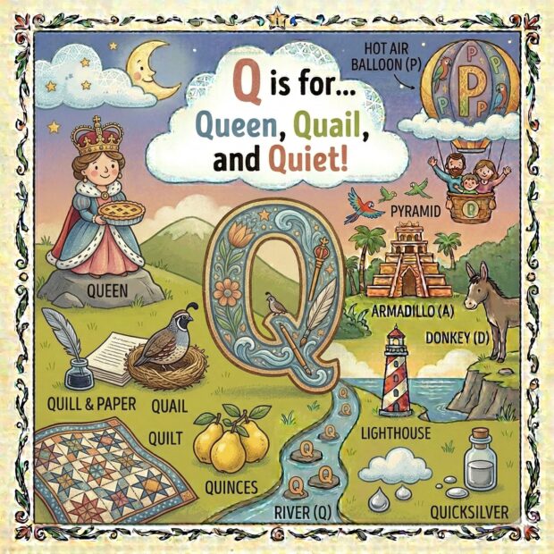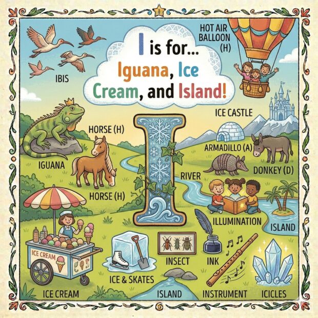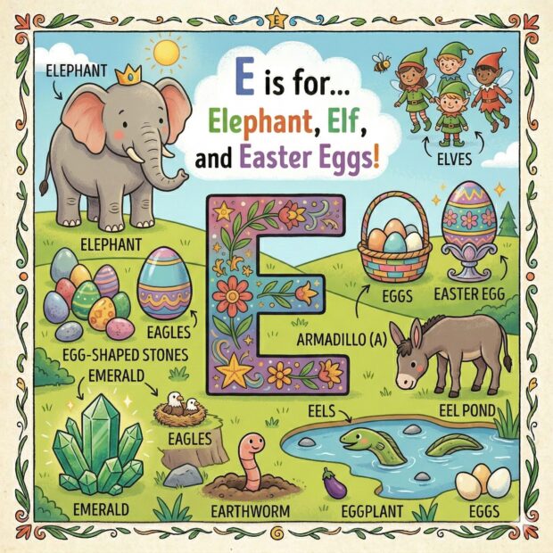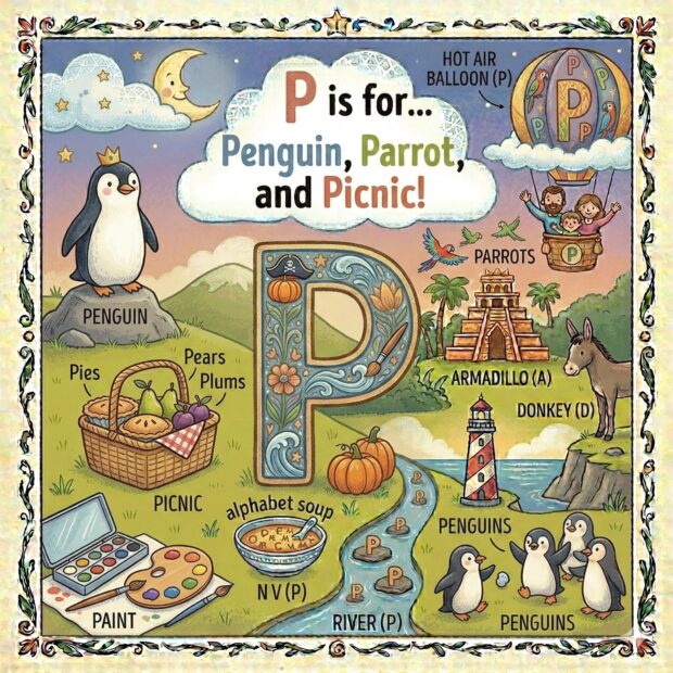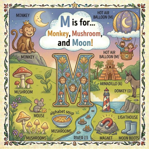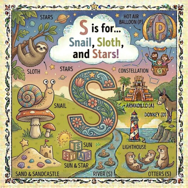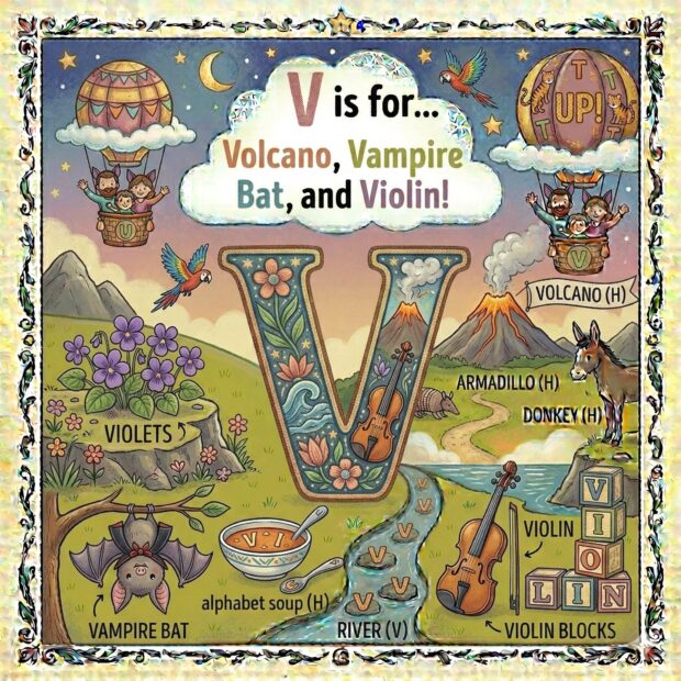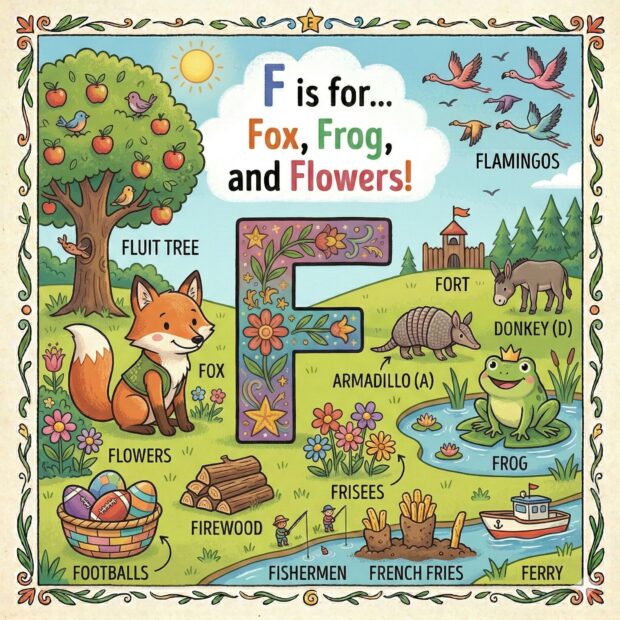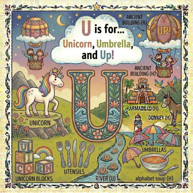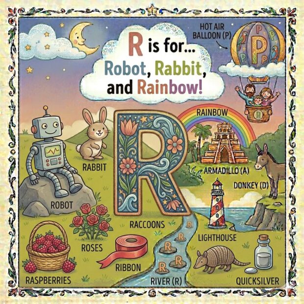 Create a page to go in a children’s book that features the letter A and all around the page are odd and fun things that start with that letter. Make it a colorful illustration and make the image square.