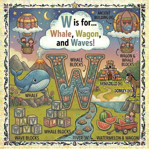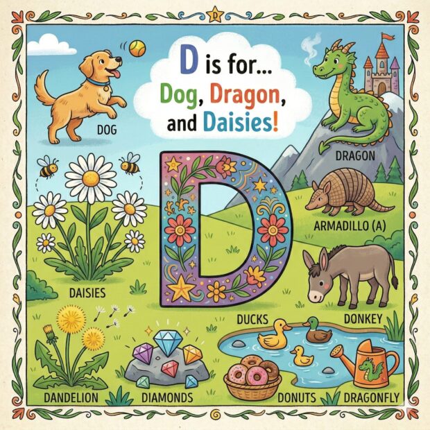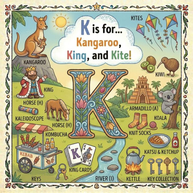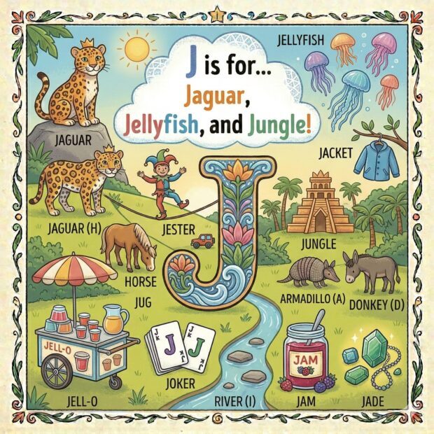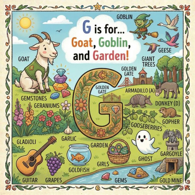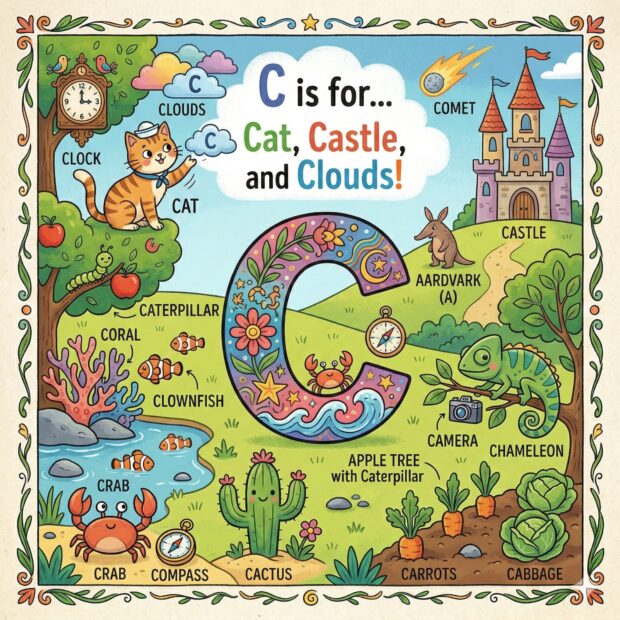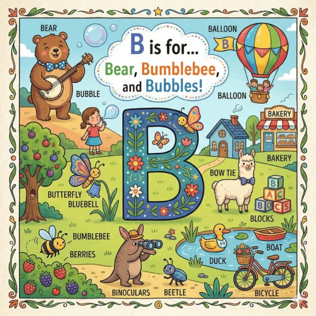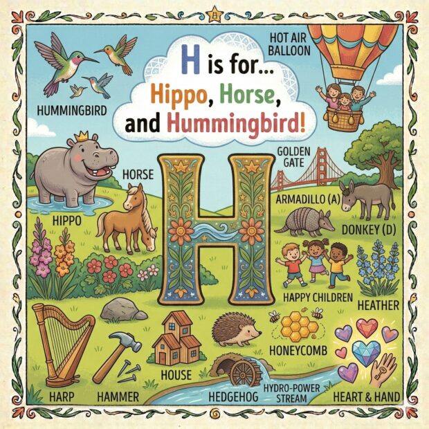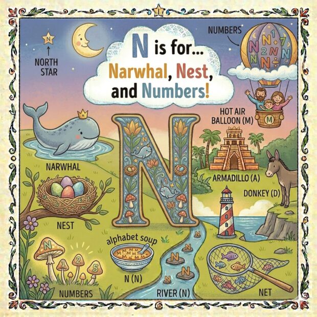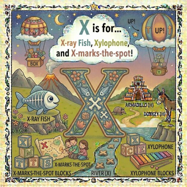 Create a page to go in a children’s book that features the letter A and all around the page are odd and fun things that start with that letter. Make it a colorful illustration and make the image square.