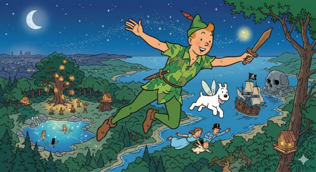 Make an image of Tintin as Peter Pan