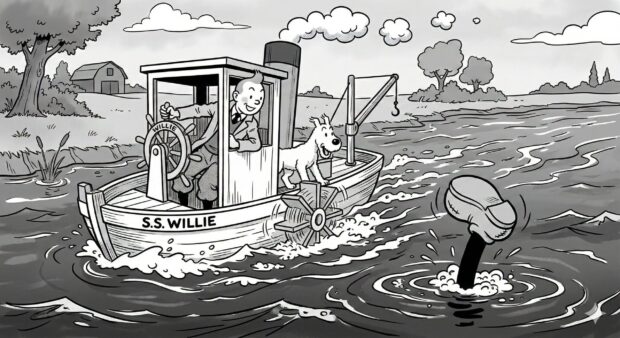 Make an image of Tintin piloting the boat in Steamboat Willie with Mickey Mouse thrown overboard, only his foot visible above the water.
