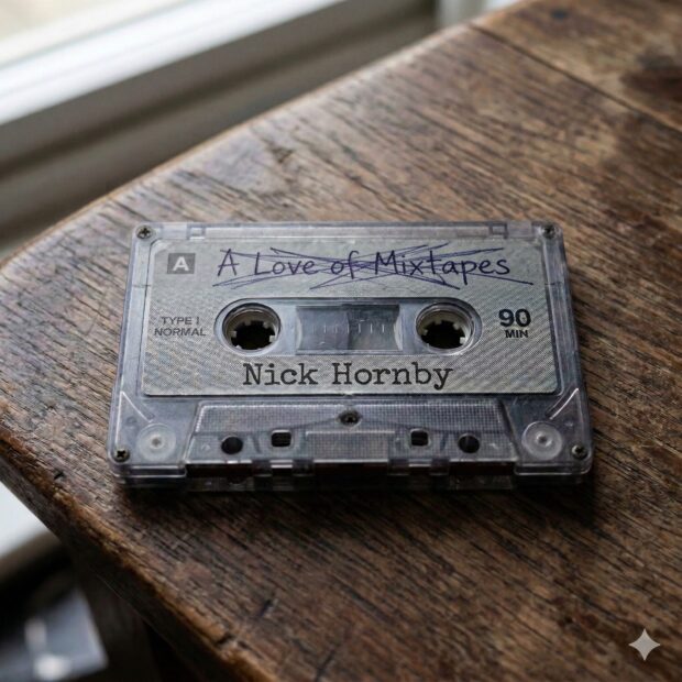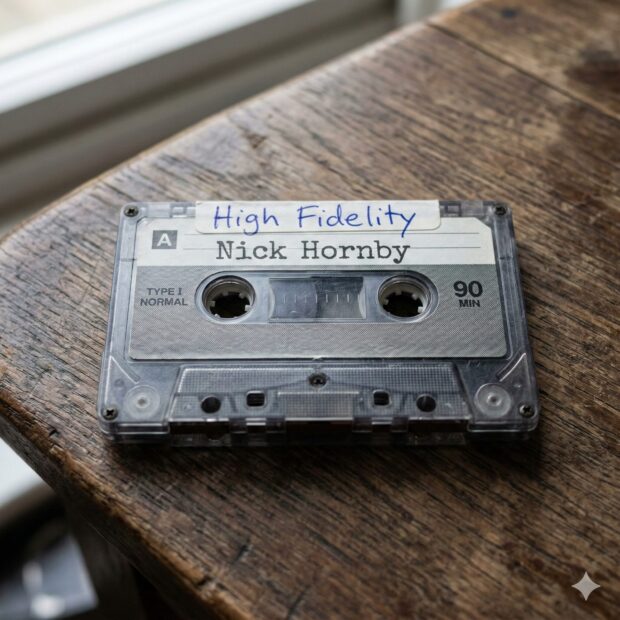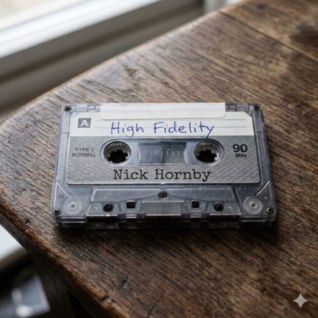 Now make a completely new image. It’s a cassette tape sitting on a table, on it at the top, written in ballpoint pen, a little messy says “High Fidelity” and lower down, printed on the factory-printed label says “Nick Hornby”. Make the image square.