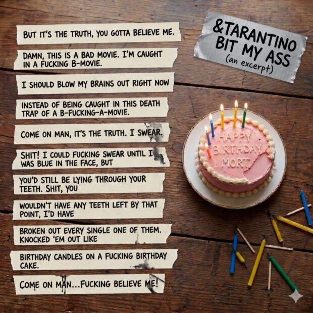 I dug through some of my old writings, looking for a piece I could set in a scene that would visually make sense. I found a short story I’d written in 1995 called “&Tarantino Bit My Ass”. It was dialogue from an imagined scene from a Quentin Tarantino film.