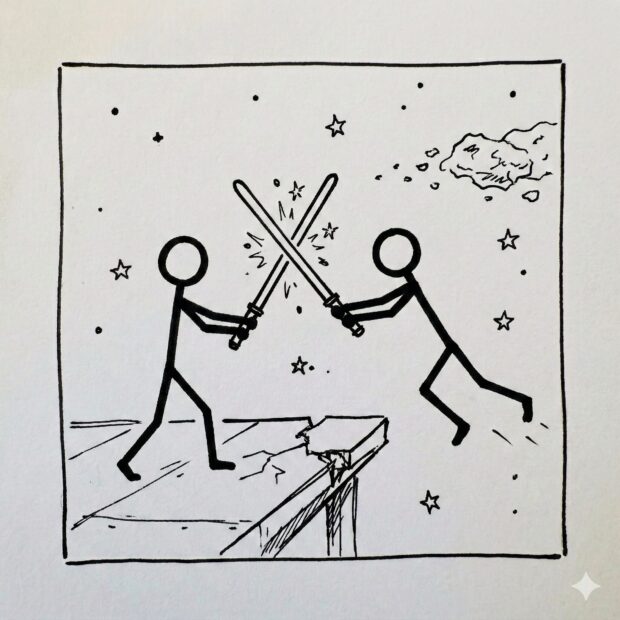 Great. How about another square image like that but it’s a lightsaber battle between stick figure 1 and stick figure 2