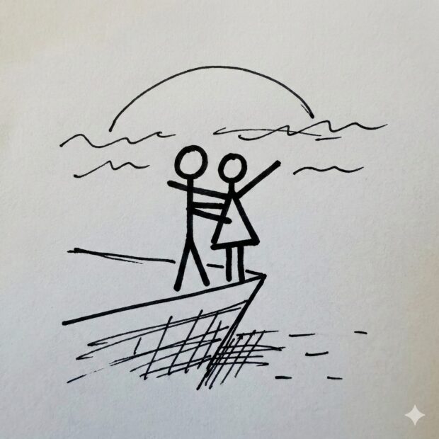 A single square image, black ink on a white background, in the exact simple stick figure style of the user’s uploaded photo. The scene is the ‘I’m flying’ moment from Titanic. Two very simple, hand-drawn stick figures—one with a simple triangle dress like the photo—stand at the edge of a basic ship’s prow. The lines are thick and look like they were drawn with a felt-tip marker. Minimalist and charmingly rough.